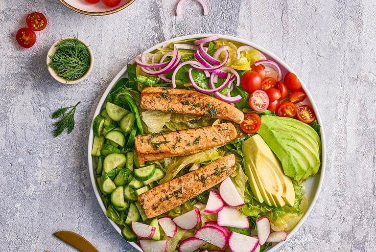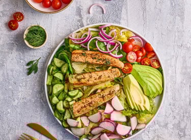 Grilled marinated Norwegian salmon served on lettuce leaves and fresh Rocca leaves with avocado, cucumber, cherry tomato, onion and red radish with house
