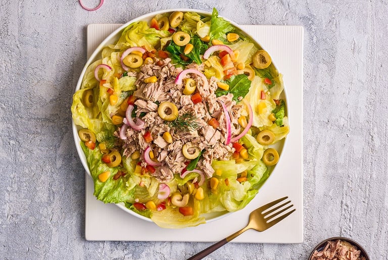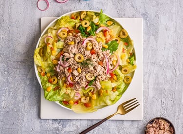 Marinated tuna meat with vinaigrette dressing with a mix of peppers, green olives, sweet corn, onions and dill served on fresh lettuce, Rocca leaves and lemon